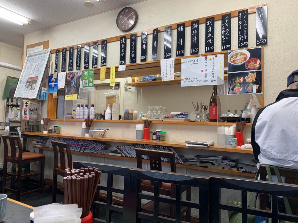 足立市場には、他にもいくつか食堂があるけれど、その中で一番ゆったり配置された席だと思う。