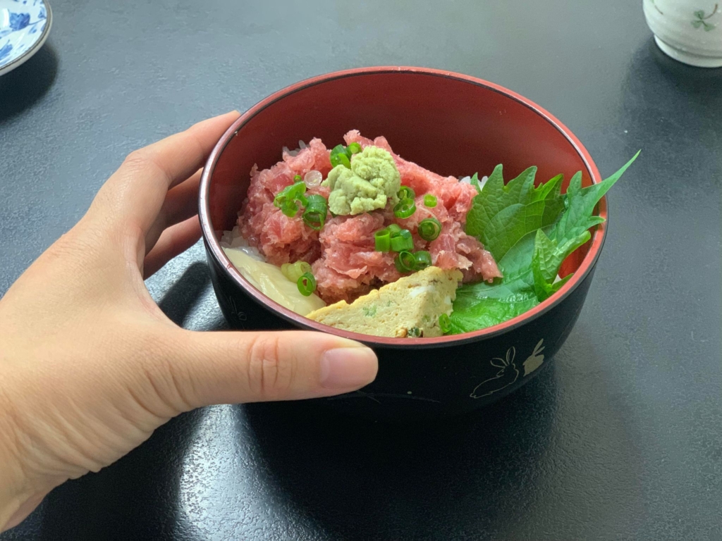 私はやっぱりネギトロ丼が好き。下記の写真ぐらいのサイズだけど、結構量、あるよ。