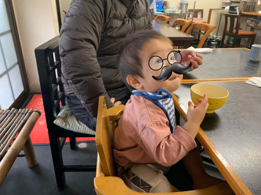 息子のうめすけが生後半年ぐらいの頃は、背中におんぶでカウンター席でラーメン食べていました笑。